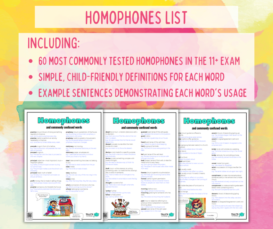 A list of the 60 most commonly tested homophones in the 11+ exam 📝
